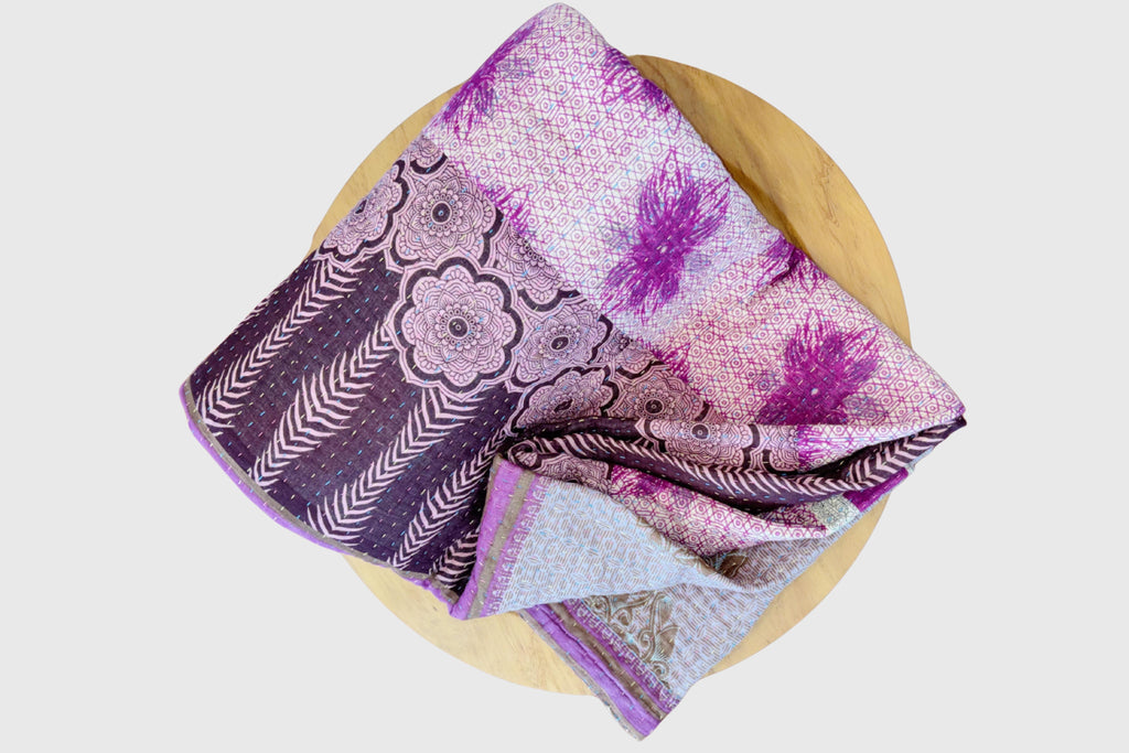 Beautiful handmade throws made in Bangladesh from recycled sari cloth by women finding a way out of slavery. Layers of time-worn sari in bright colours and patterns are stitched in neat, even rows.