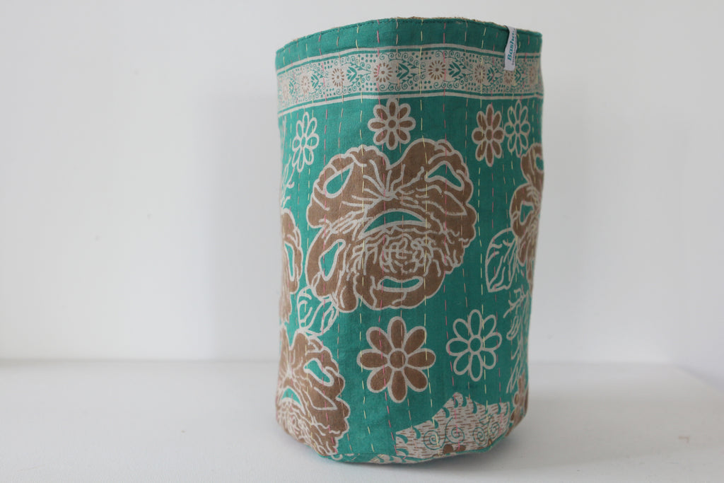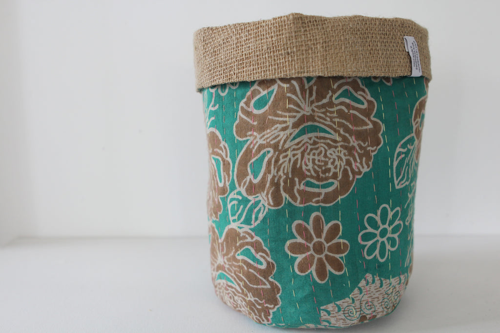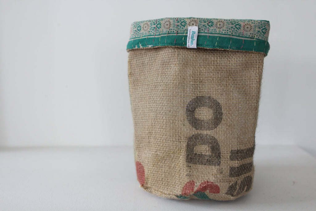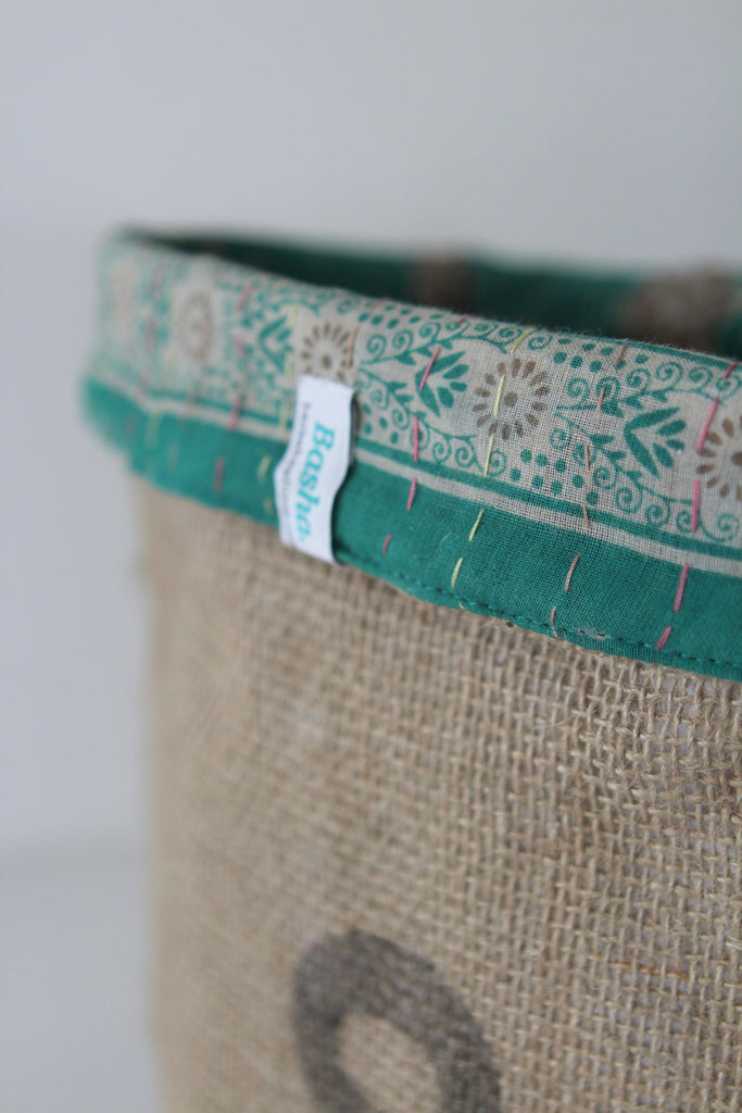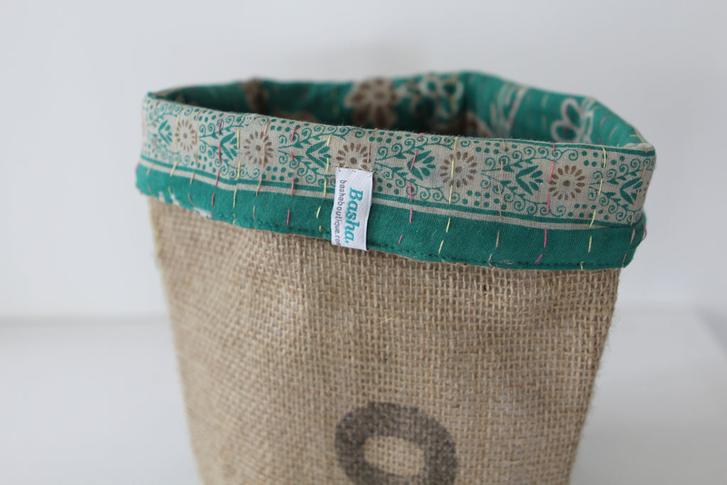This fun reversible basket is made with an old coffee jute bag and lined with beautiful recycled sari kantha fabric. It's perfect for storing items around your home, great for kitchen or bathroom items, desk bits, a lovely plant, or a bottle of something special.