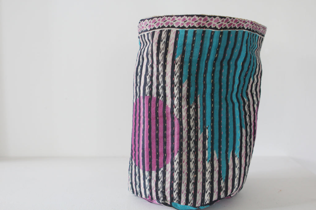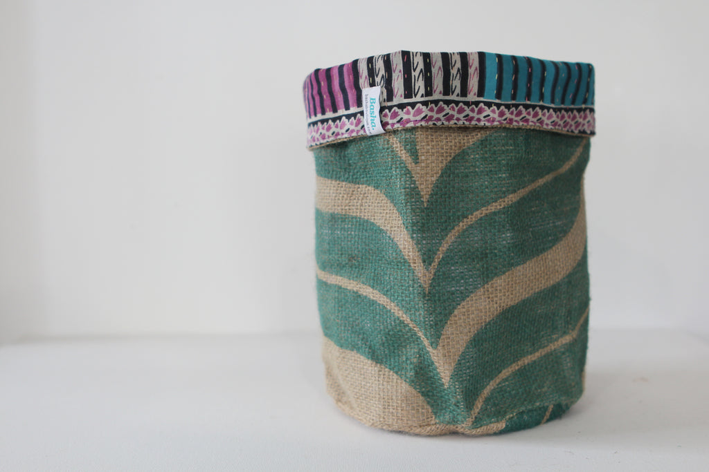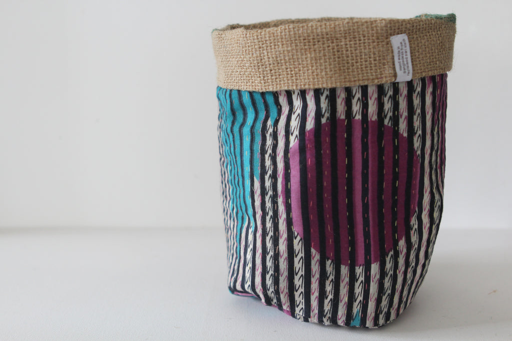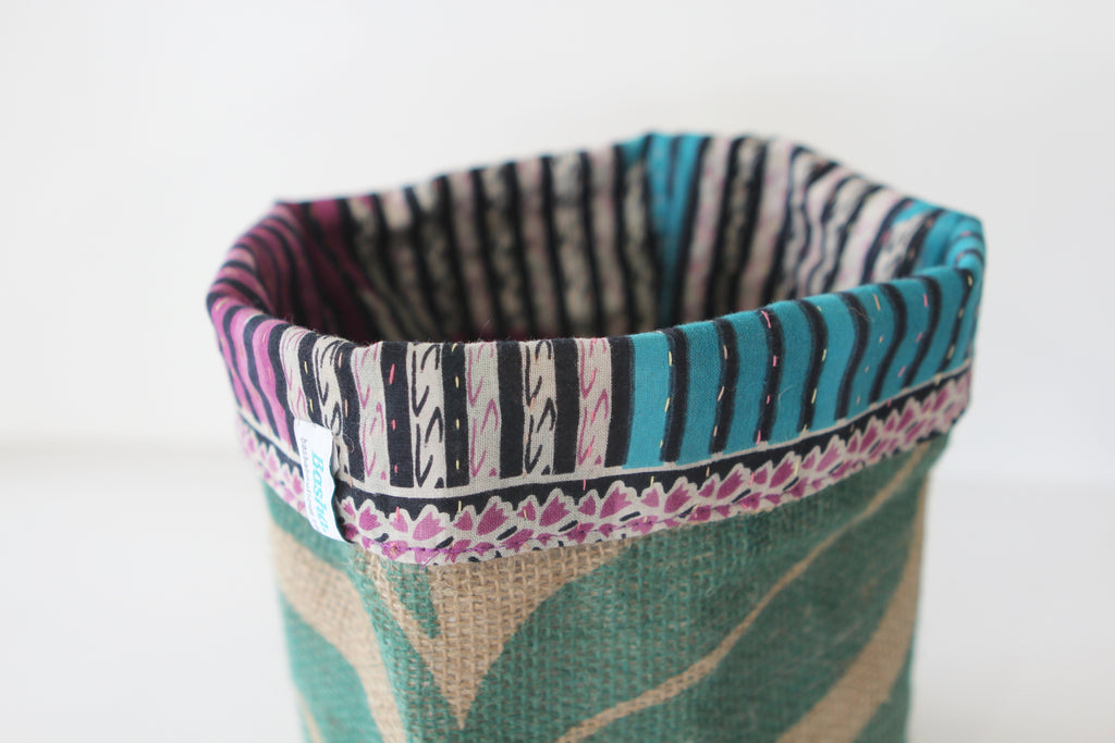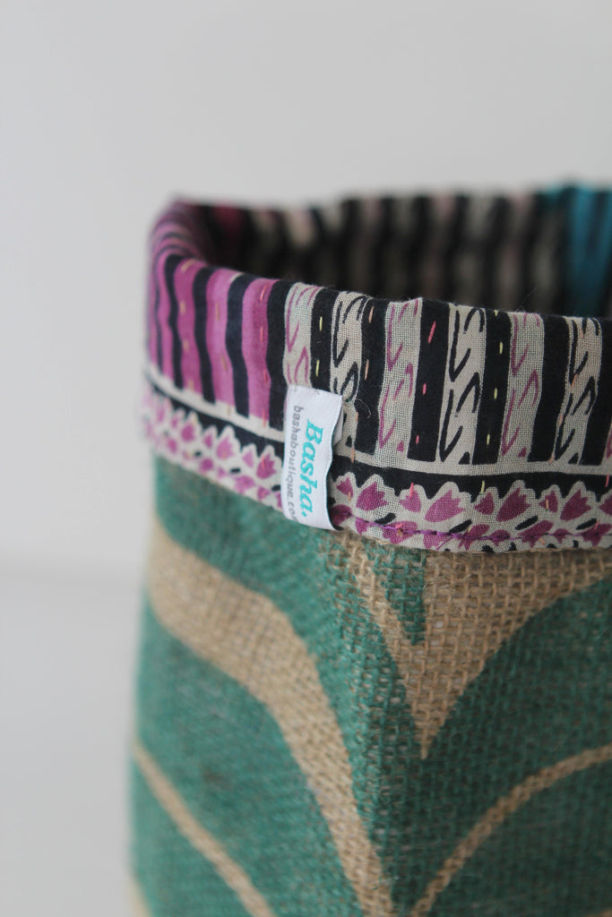 This fun reversible basket is made with an old coffee jute bag and lined with beautiful recycled sari kantha fabric. It's perfect for storing items around your home, great for kitchen or bathroom items, desk bits, a lovely plant, or a bottle of something special.