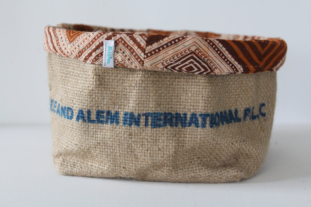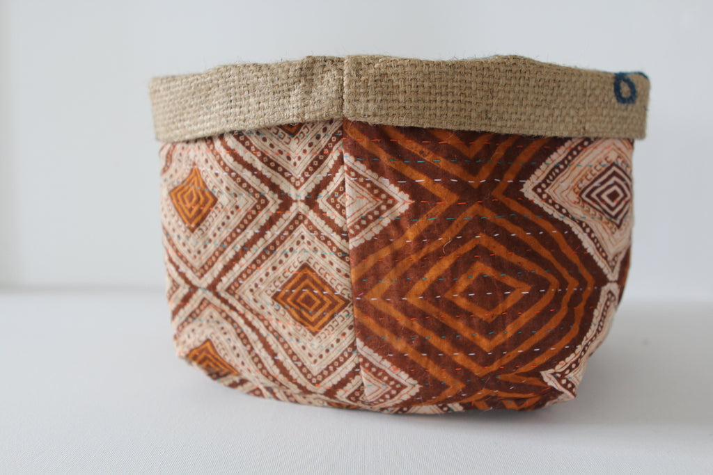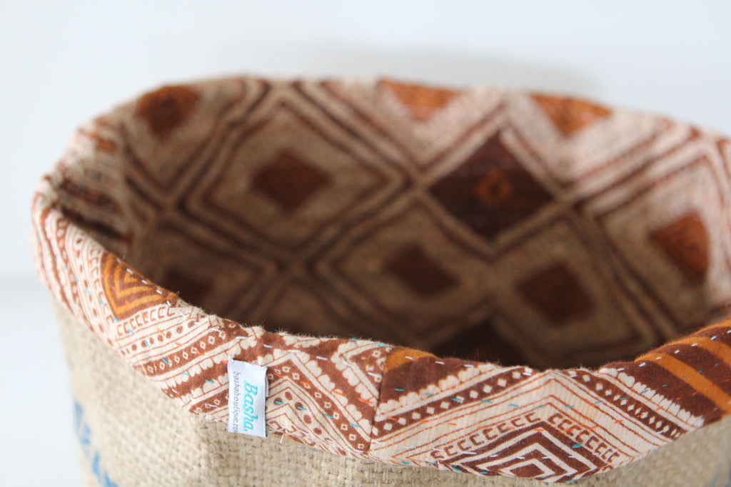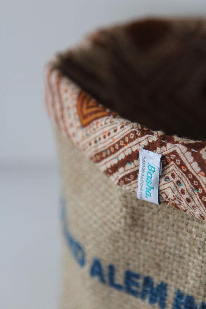 This fun reversible basket is hand-made from burlap coffee or rice sacks, and lined with recycled sari cloth with colourful stitching. It's perfect for you to store items all around the house: keys, desk bits, toiletries, or a lovely plant. You can use it in many different ways.