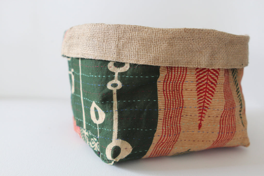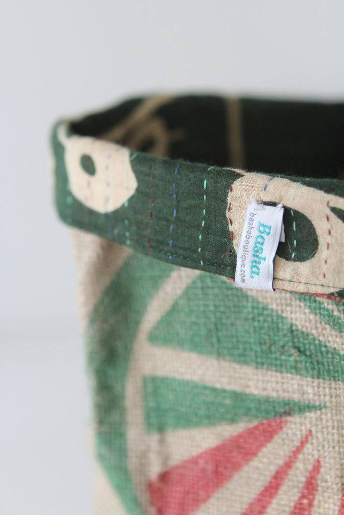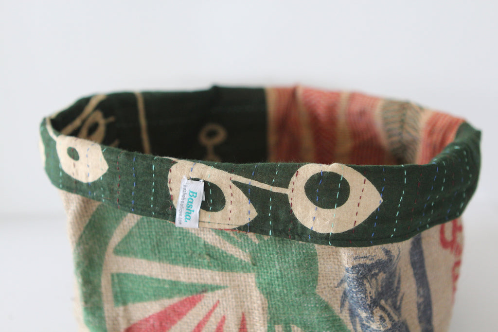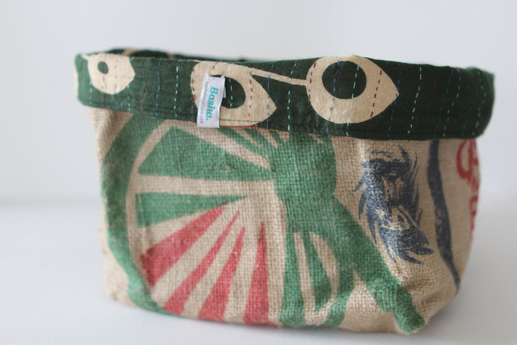 This fun reversible basket is hand-made from burlap coffee or rice sacks, and lined with recycled sari cloth with colourful stitching. It's perfect for you to store items all around the house: keys, desk bits, toiletries, or a lovely plant. You can use it in many different ways.
