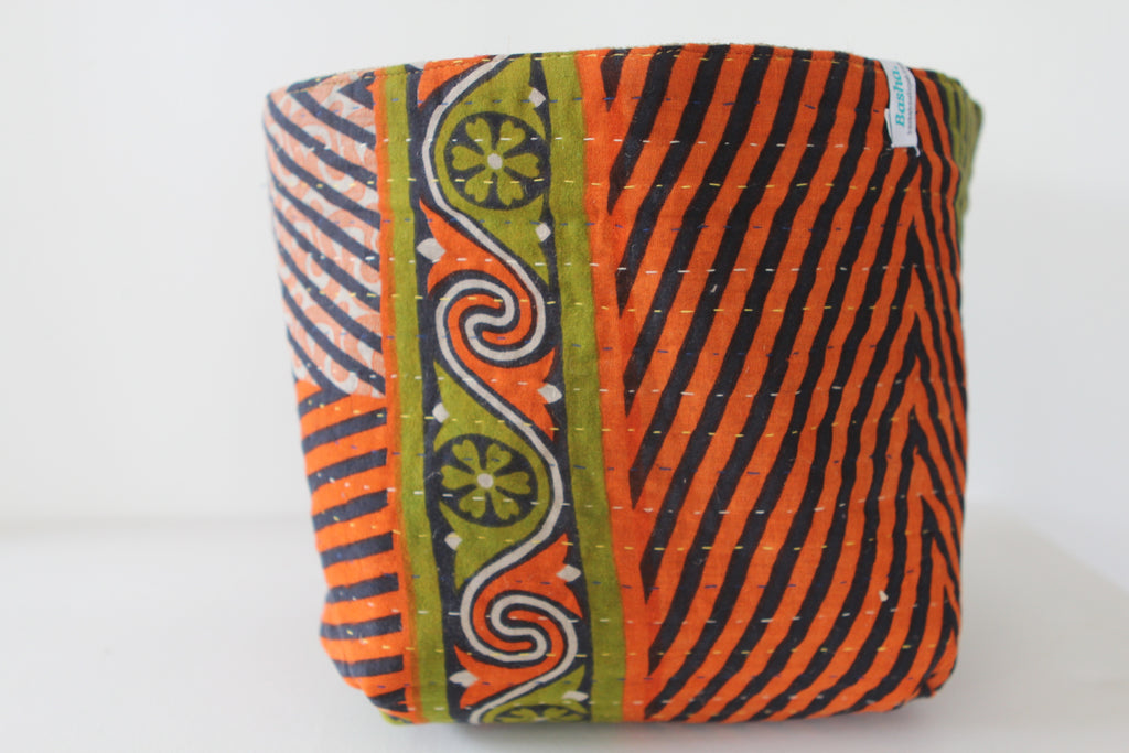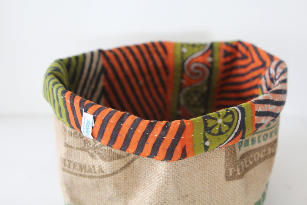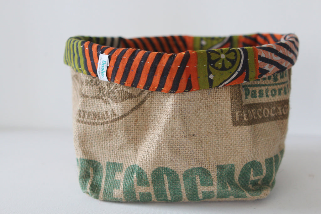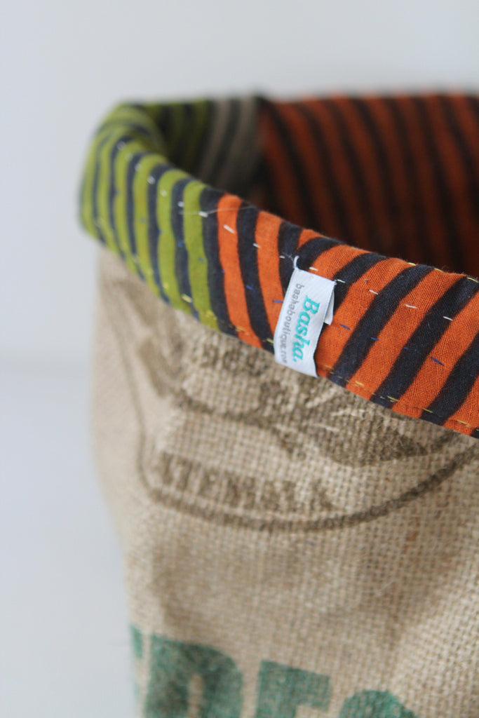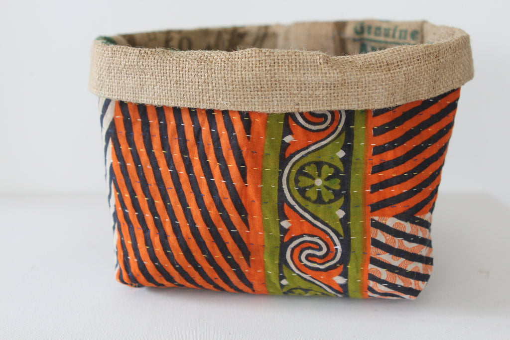 This fun reversible basket is hand-made from burlap coffee or rice sacks, and lined with recycled sari cloth with colourful stitching. It's perfect for you to store items all around the house: keys, desk bits, toiletries, or a lovely plant. You can use it in many different ways.