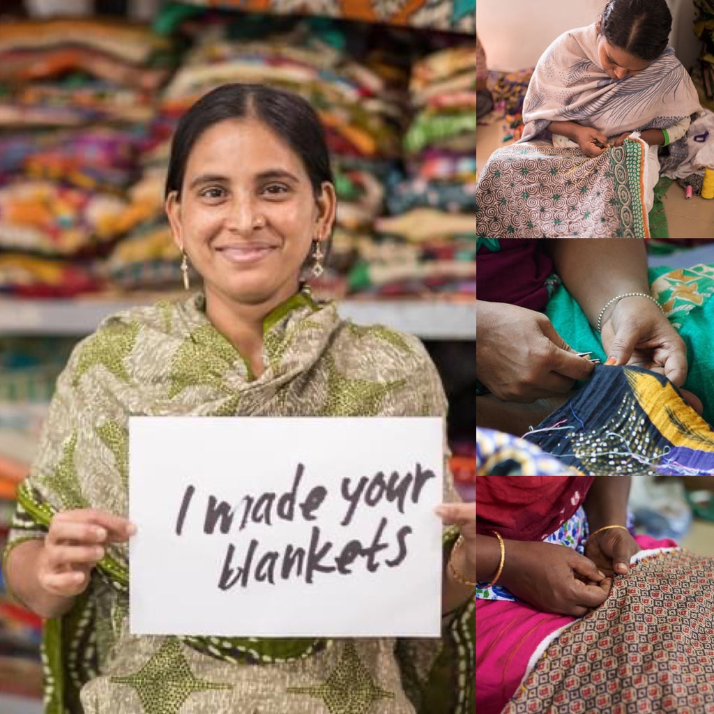 Layers of time-worn sari in bright colours and patterns are stitched in neat, even rows. Each large kantha blanket takes one artisan approximately 46 hours to make. Find the name of the artisan that has made it on the label!