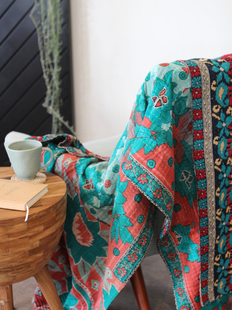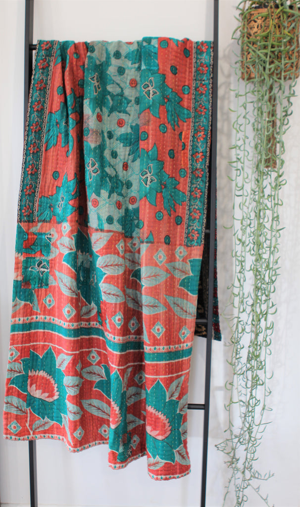 Sari Kantha Large Throw - Green, Peach & Red Flowers