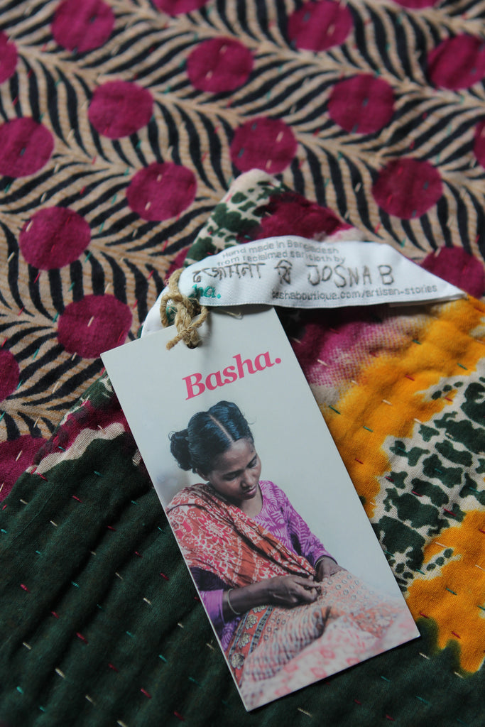 Layers of time-worn sari in bright colours and patterns are stitched in neat, even rows. Each large kantha blanket takes one artisan approximately 46 hours to make. Find the name of the artisan that has made it on the label!
