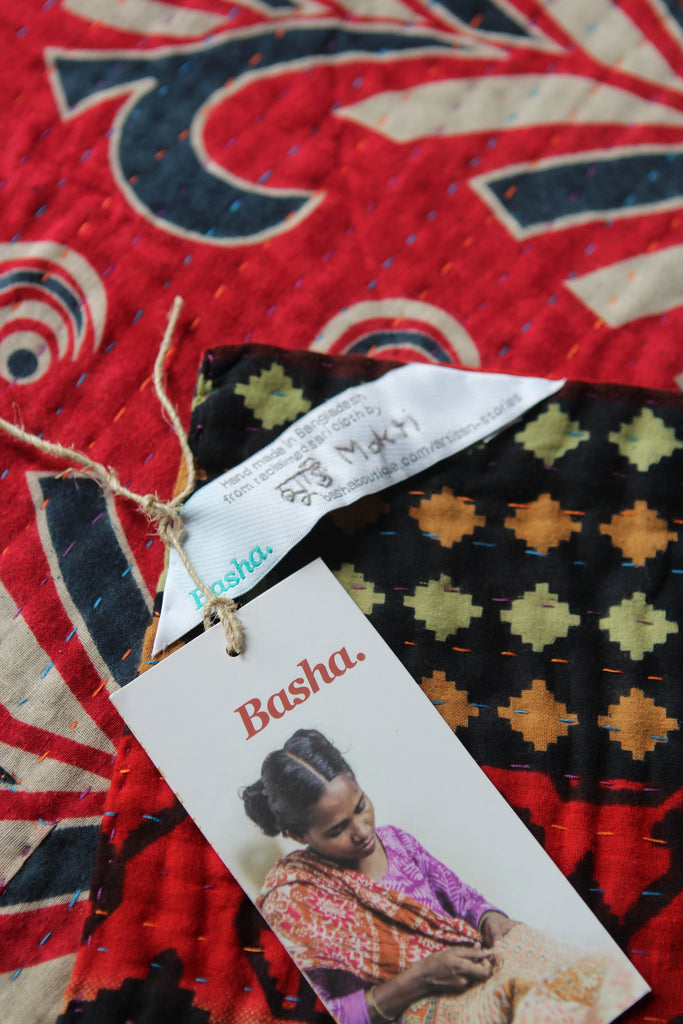 Layers of time-worn sari in bright colours and patterns are stitched in neat, even rows. Each large kantha blanket takes one artisan approximately 46 hours to make. Find the name of the artisan that has made it on the label!