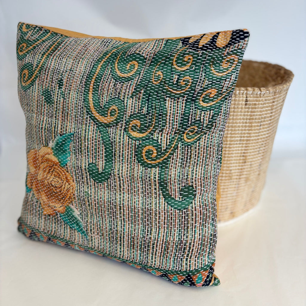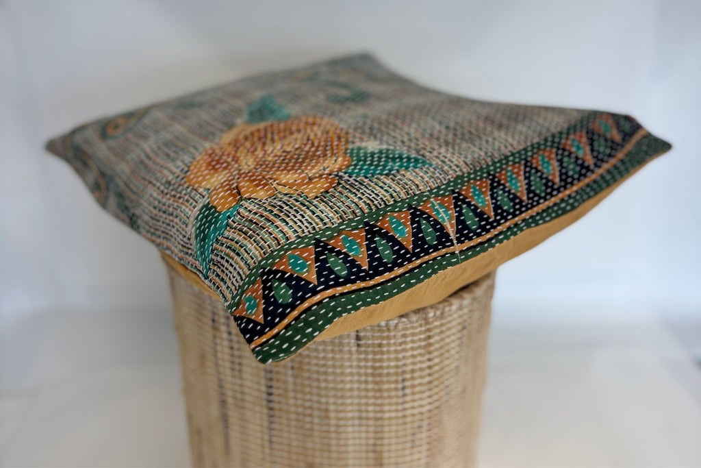 Add colour and character to your home with this beautiful handcrafted cushion cover, made from recycled fabrics and finished with traditional hand-sewn Kantha stitching. Each piece is completely unique, celebrating the natural variations and charm of repurposed textiles.