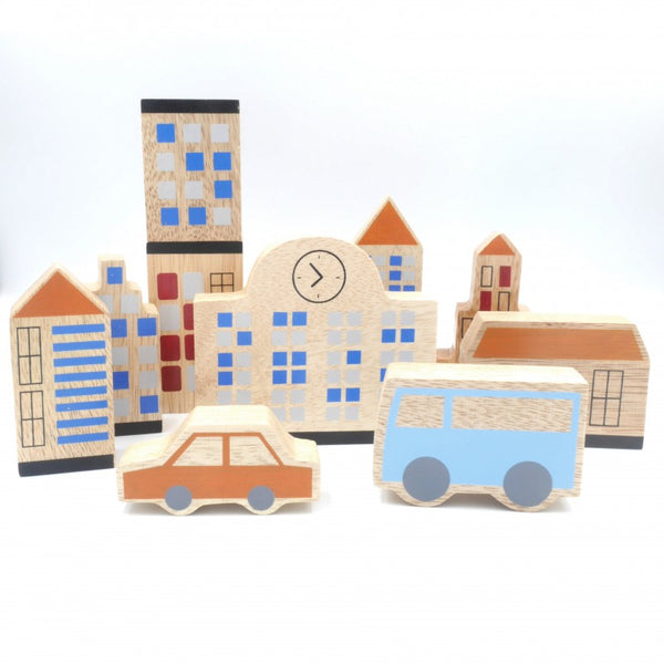This 10-piece wood-block town set will give hours of fun to your wee ones. Comes in a handy storage bag.