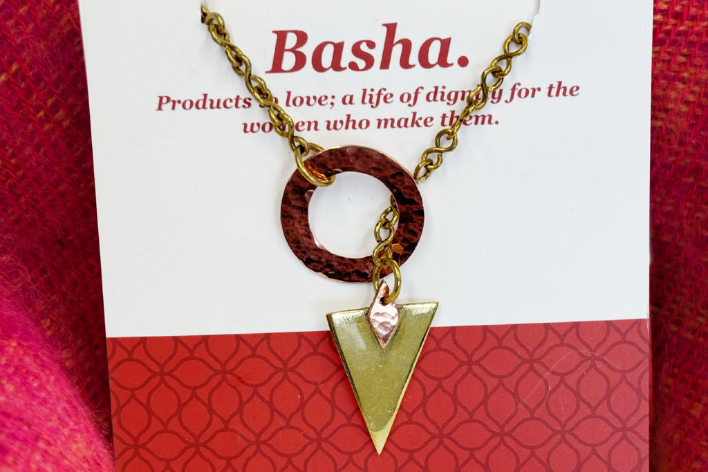 An adjustable brass and copper triangle pendant hangs from a handcrafted chain, finished with a unique lasso feature. Versatile and easy to wear, it’s designed to be styled your way.